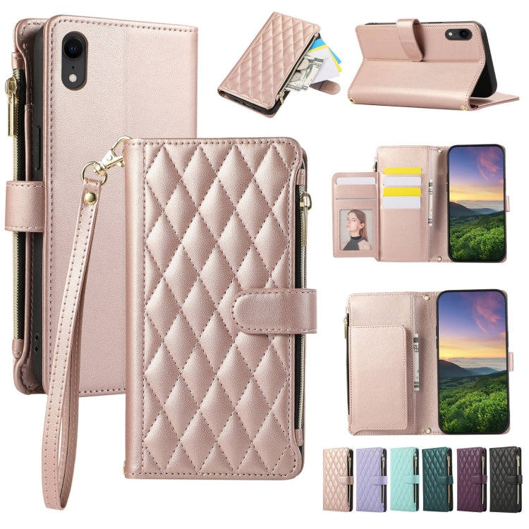 Funda de Cuero Tipo Billetera con Cremallera en Forma de Rombo para iPhone Xr (Oro Rosa)