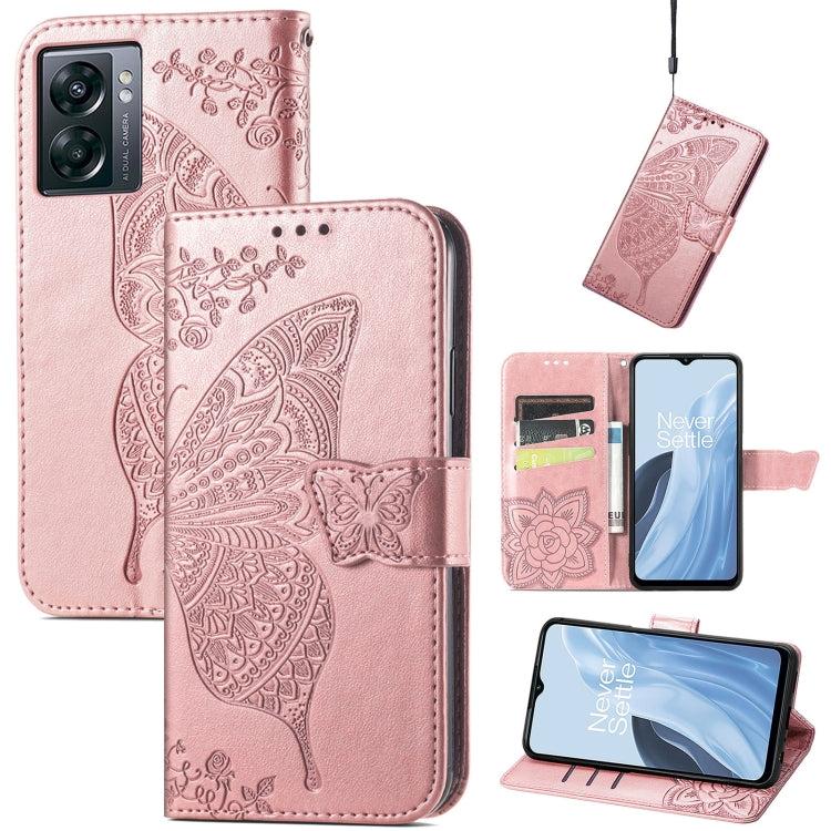 Funda de Cuero para OnePlus Nord N300 con Tapa En Relieve Butterfly Love Flower (Oro Rosa)