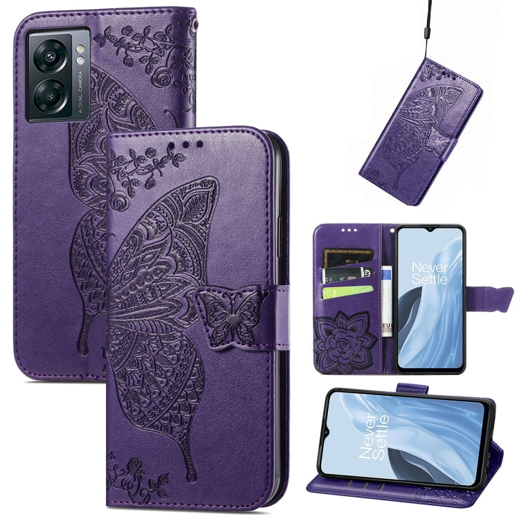 Funda de Cuero para OnePlus Nord N300 con Tapa En Relieve Butterfly Love Flower (Púrpura Oscuro)