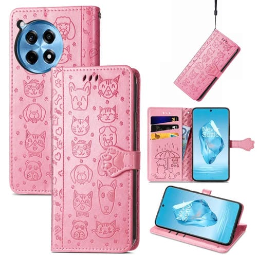 Funda de Piel con Relieve Gato y Perro para OnePlus Ace 3 Pro (Rosa)