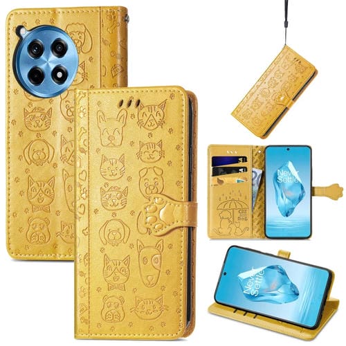 Funda de Piel con Relieve Gato y Perro para OnePlus Ace 3 Pro (Amarilla)