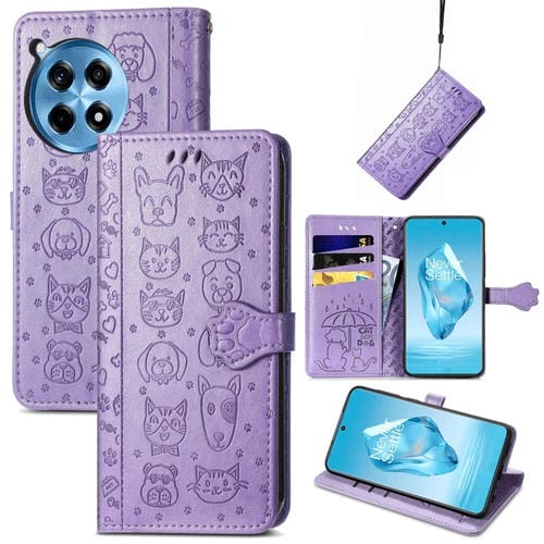 Funda de Piel con Relieve de Gato y Perro para OnePlus Ace 3 Pro (Morado)