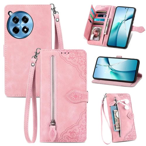 Funda de Cuero con Cremallera para OnePlus Ace 3 Pro (Rosa) con Diseño de Flores en Relieve
