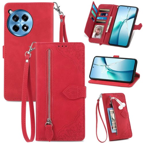 Funda de Cuero con Cremallera para OnePlus Ace 3 Pro (Rojo) con Flores en Relieve