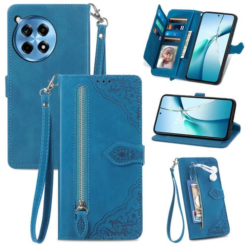 Funda de Cuero con Cremallera para OnePlus Ace 3 Pro con Flores en Relieve (Azul)