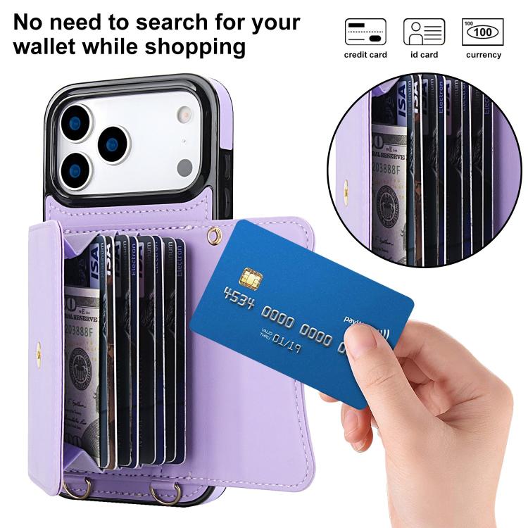 Funda para iPhone 17 Pro Max con ranura para tarjeta RFID y cordón largo (morado)
