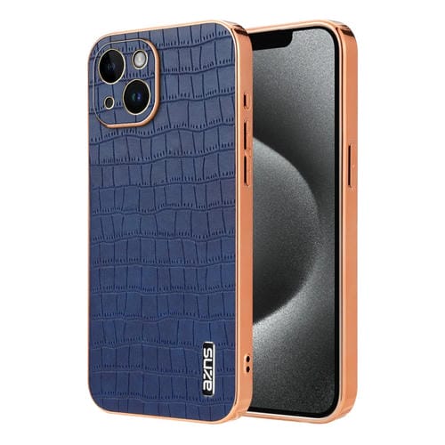 Estuche para teléfono Azns iPhone 14 Plus cobertura total textura cocodrilo marco galvanizado (Azul)