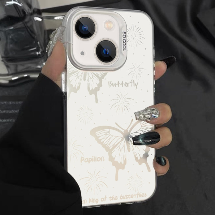 Caja de Teléfono Híbrida TPU PC para iPhone 14 con Pintura Plateada (Mariposa Hueca Blanca)