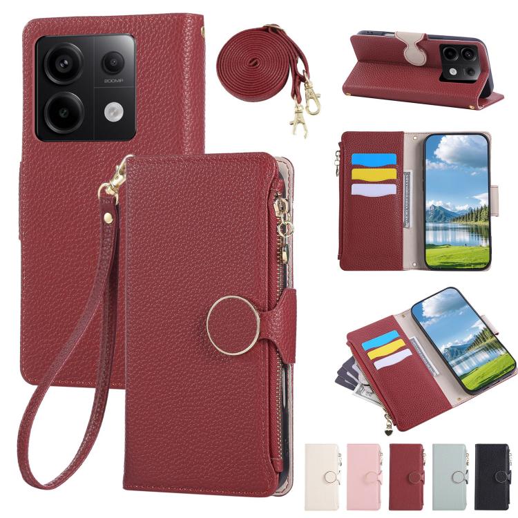 Funda de cuero con hebilla redonda y cremallera para Redmi Note 13 Pro 5G, con correa cruzada (roja)