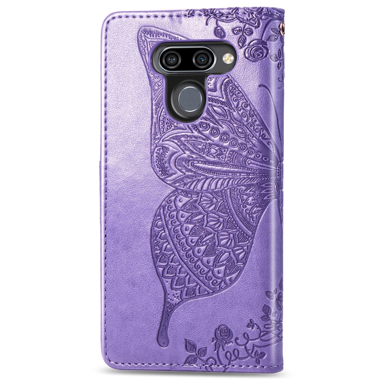 Funda de Cuero Butterfly Love Flowers con Tapa Horizontal en Relieve para LG K50 con Soporte y Ranuras para Tarjetas