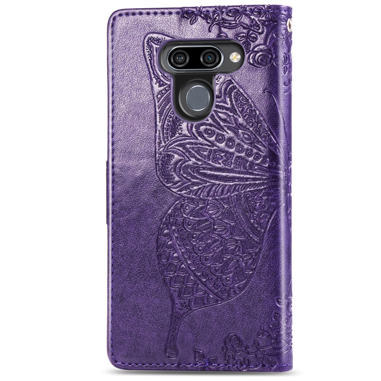 Funda de Cuero Butterfly Love Flowers para LG K50 con Tapa Horizontal, Soporte, Ranuras, Billetera y Cordón (Dark Púrpura)