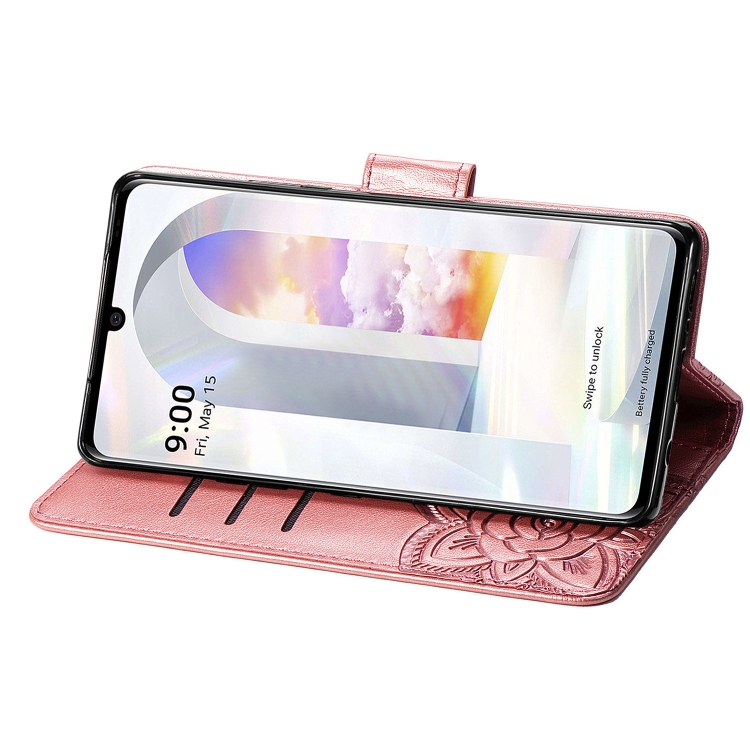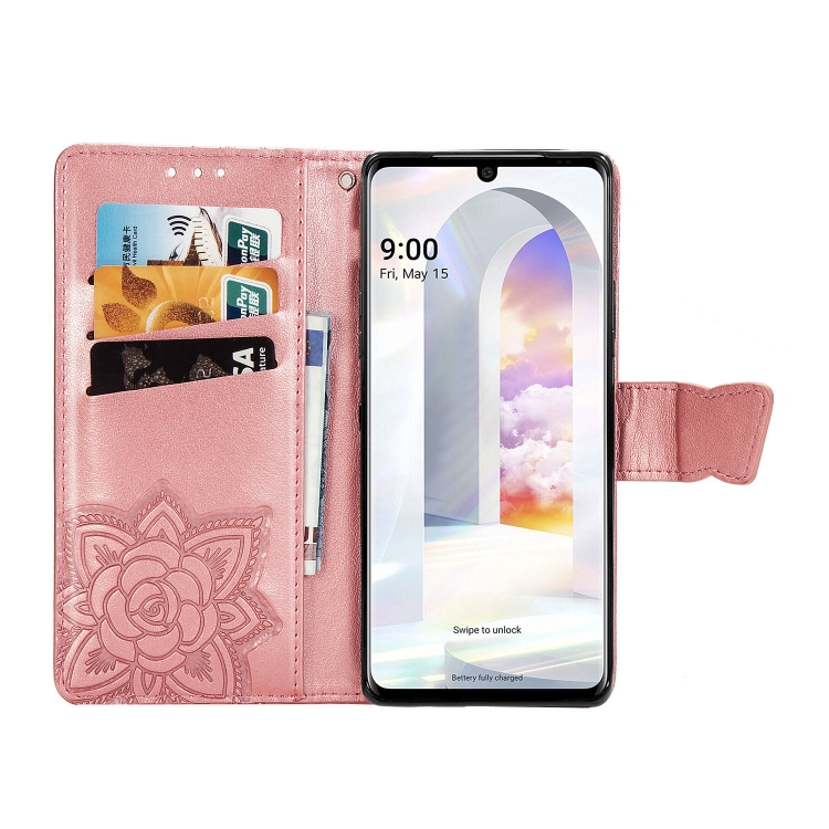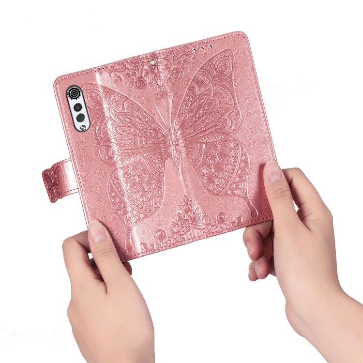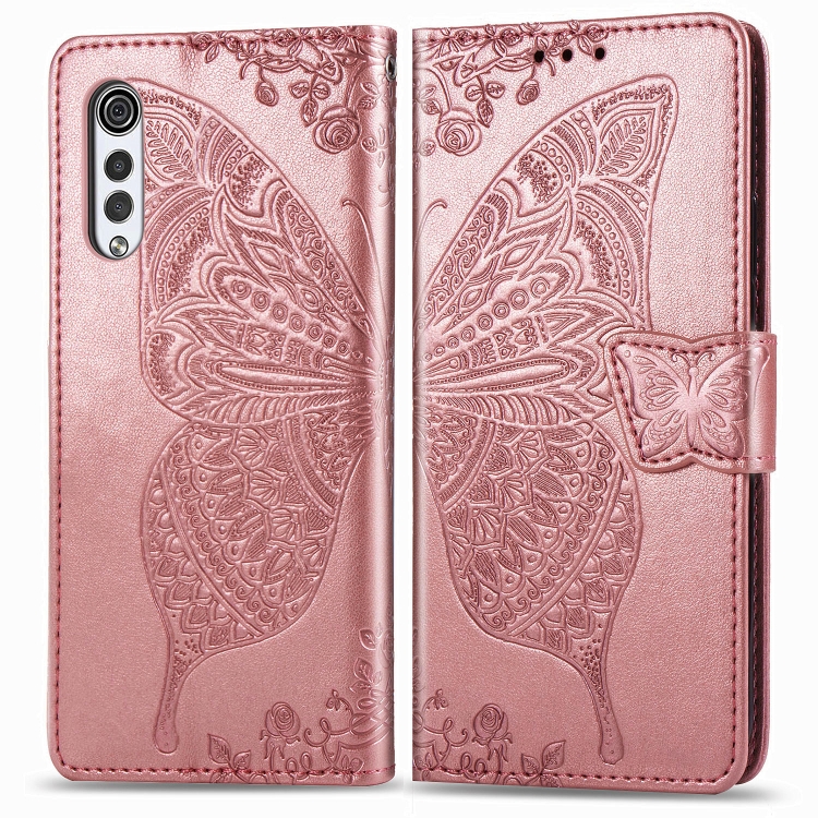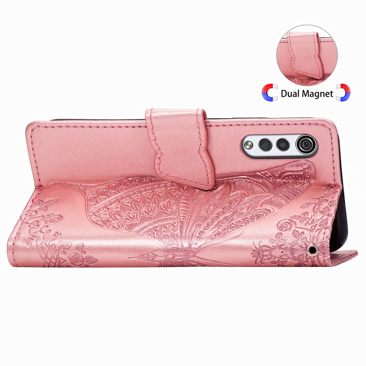 Funda de Cuero Butterfly Love Flowers para LG Velvet 2 Pro con Soporte, Ranuras y Cordón (Oro Rosa)