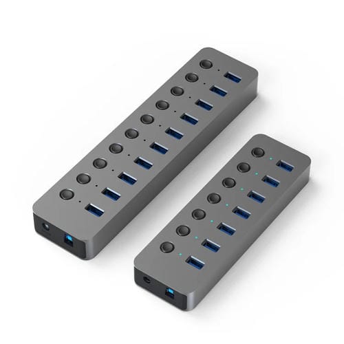- 10 Puertos USB-A con velocidad de transmisión de 5Gbps; fuente de Alimentación de 12V 4A (48W); Cable de 1 metro; interfaz de entrada USB 3.0 tipo B; dimensiones 22.8 x 5.6 x 2.34 cm; interruptor independiente con indicador LED