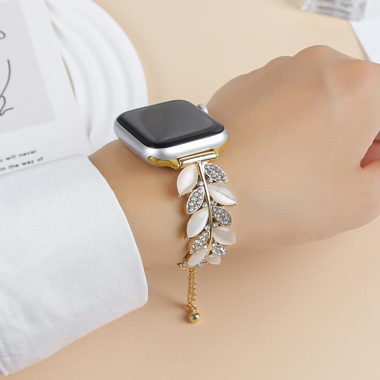 Correa de aleación con diamantes en forma de hoja para Apple Watch de 42 mm, 41 mm, 40 mm y 38 mm (dorada y blanca)