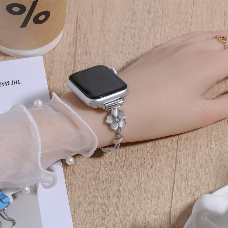 Correa de aleación con trébol de cuatro hojas para Apple Watch de 42 mm, 41 mm, 40 mm y 38 mm (plata + trébol de cuatro hojas plateado)
