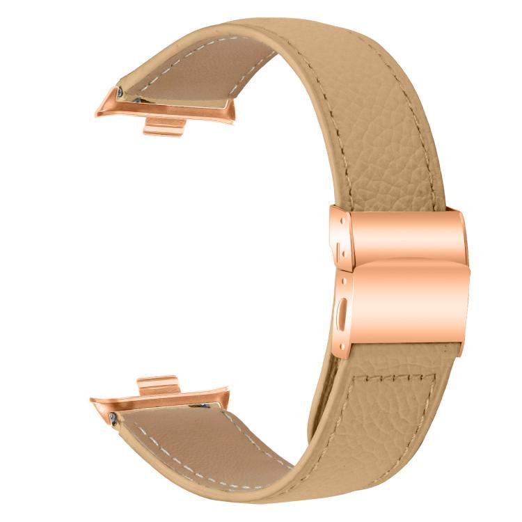 Correa de cuero con hebilla trasera de tortuga en oro rosa y textura de lichi para Xiaomi Smart Band 9 Pro y Redmi Watch 5 (Camello)