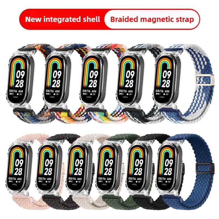 Correa de reloj elástica trenzada de nailon con hebilla magnética y marco de PC transparente para Xiaomi Smart Band 9/8 (negra)