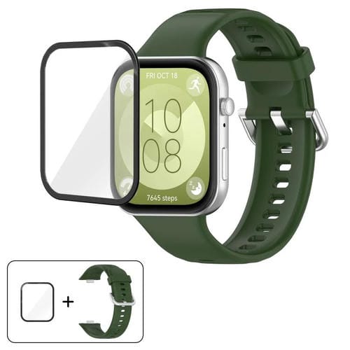 Correa de silicona con hebilla de acero plateada y película curva 3D para Huawei Watch Fit 3 (verde militar)