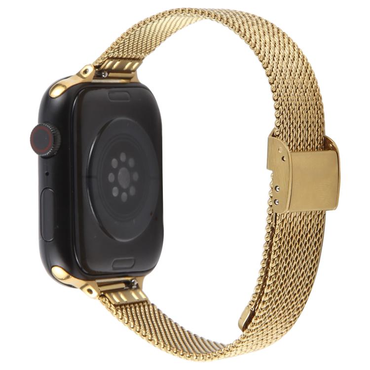 Correa fina de metal milanés con hebilla integrada en relieve para Apple Watch de 46 mm, 49 mm, 45 mm y 44 mm (dorada)