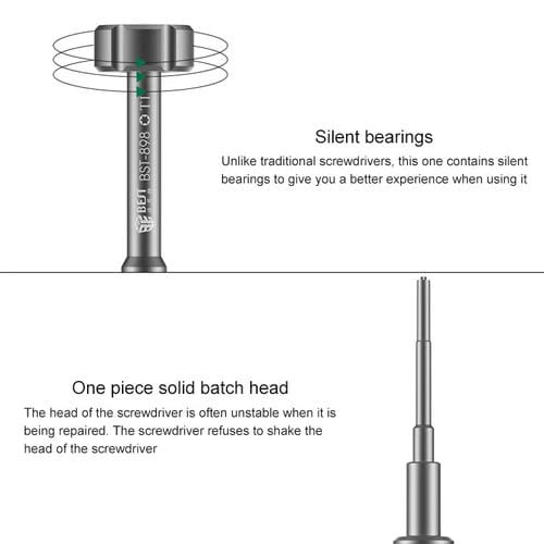 El destornillador 6 en 1 BST-898 es una herramienta especializada diseñada para el desmontaje 3D de Teléfonos Móviles. Su diseño compacto y ligero facilita el manejo en reparaciones Técnicas, ofreciendo un mango fabricado en aluminio de aviación para mayor durabilidad y un cabezal de acero refinado con ajuste preciso y absorción magnética potente. Este destornillador es compatible con diversas marcas genéricas y está orientado a usuarios que reparan por cuenta propia y profesionales que requieren precisión en la manipulación de componentes electrónicos Móviles. Cuenta con varias puntas intercambiables en tamaños 0.6, 1.5, T1, T2, 0.8 y 2.5, adecuadas para diferentes tipos de tornillos presentes en dispositivos Móviles.
