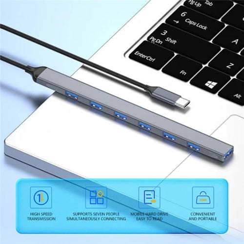 - Puerto de entrada Tipo C; salida: 1 Puerto USB 3.0 y 6 Puertos USB 2.0; Soporte plug-and-play sin controladores