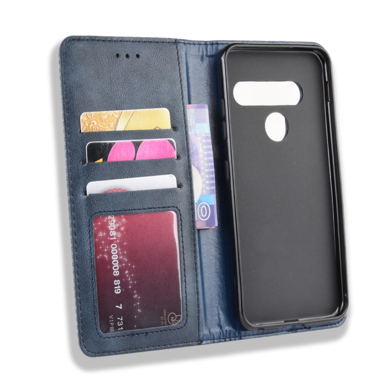 Estuche de Cuero LG G8S Thinq Tapa Horizontal Textura Caballo Loco Hebilla Magnética Soporte Ranuras Tarjetas Marco Fotos (Azul)
