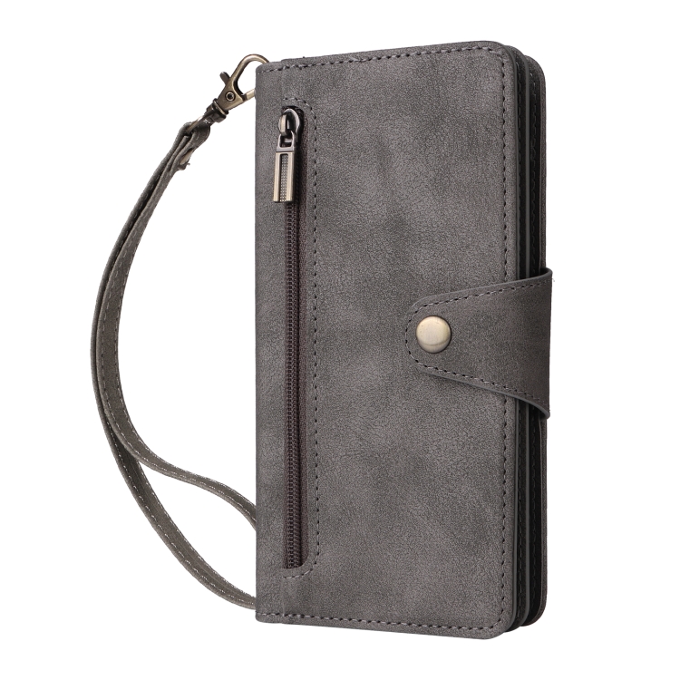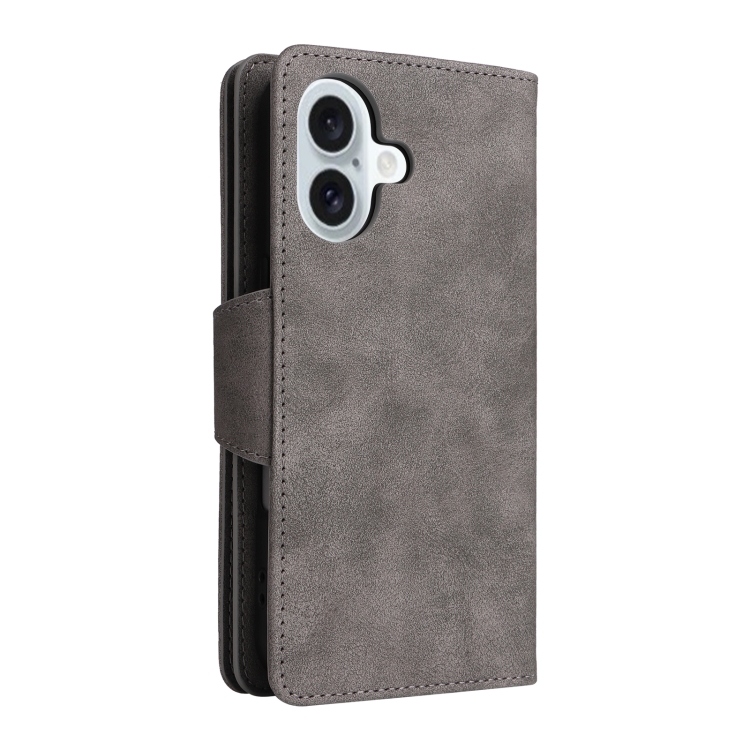Funda de Cuero iPhone 16 Plus con Tres Pliegues y Hebilla de Remache (Gris)