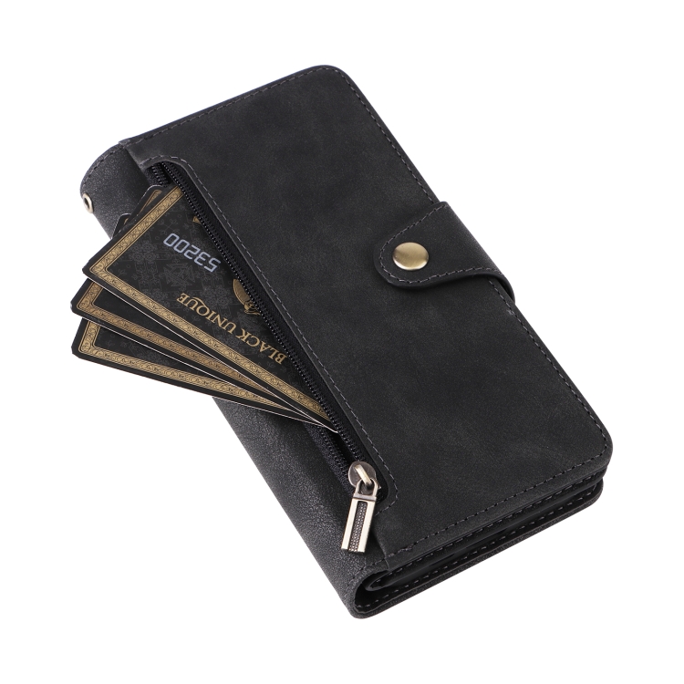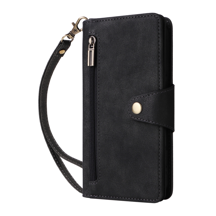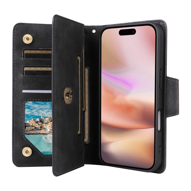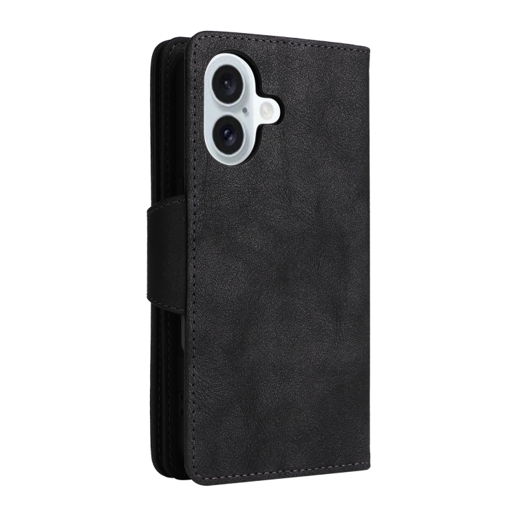Funda de Cuero para iPhone 16 Plus con Tres Pliegues y Hebilla de Remache (Negro)