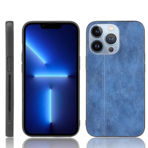 Estuche PC cuero de vaca costura para iPhone 13 Pro (Azul)