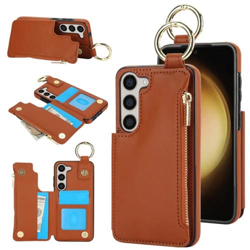 Estuche para Teléfono Samsung Galaxy S23 5G Rfld con Cremallera y Anillo Doble Hebilla Antirrobo (Marrón)