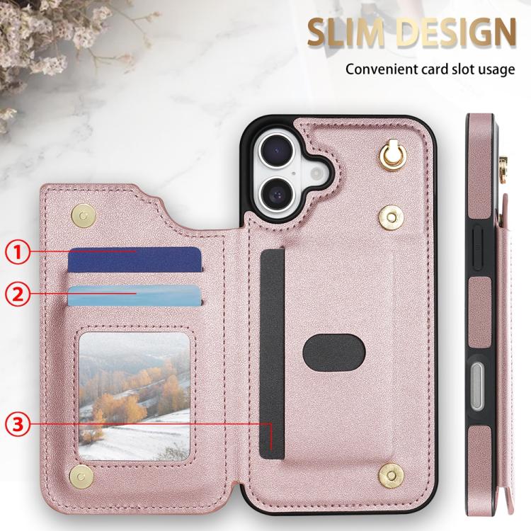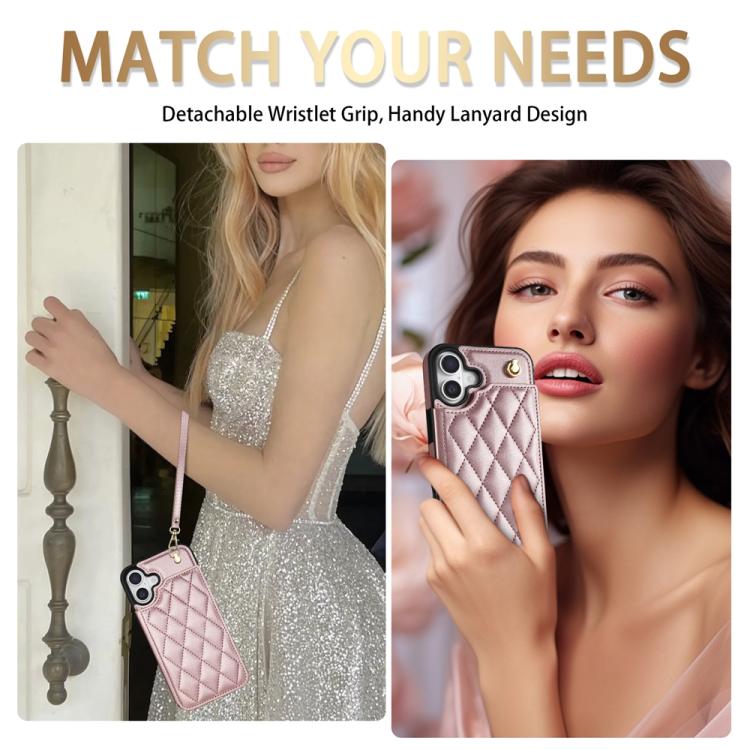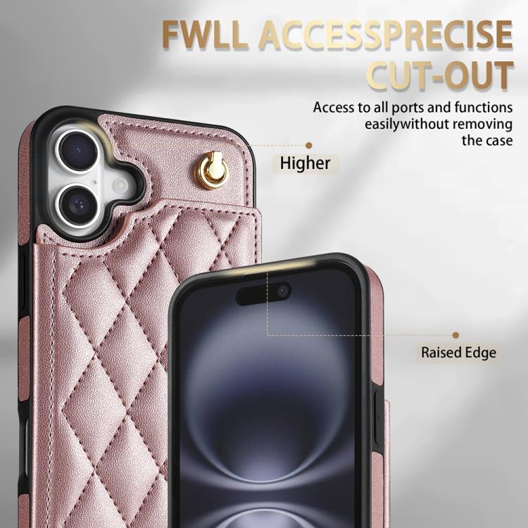 Estuche para Teléfono iPhone 16 con Ranuras para Tarjetas y Hebilla Doble Rombal con Cordón (Oro Rosa)
