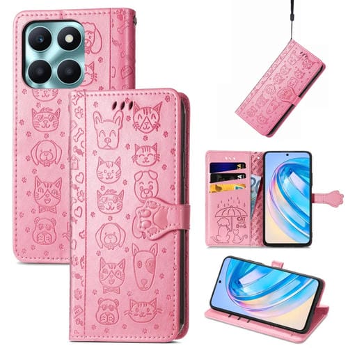 Funda para Teléfono For Honor X6A Cuero con Relieve de Perro y Gato (Rosa)