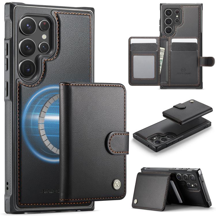 For Samsung Galaxy S22 Ultra 5G JEEHOOD J09 Buckle Card Bag MagSafe Magnetic Style RFID Leather Phone Case(Black)