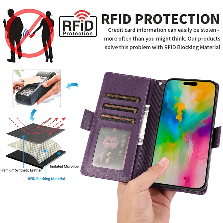 Funda de Cuero Antirrobo Rfid para iPhone 16 Pro con Hebilla Lateral (Morado Oscuro)