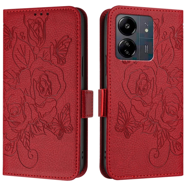 Funda de Cuero Antirrobo Rfid con Relieve Rosa para Redmi 13C 4G Global / Xiaomi Poco C65 (Roja)