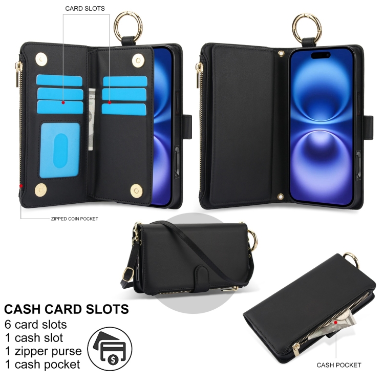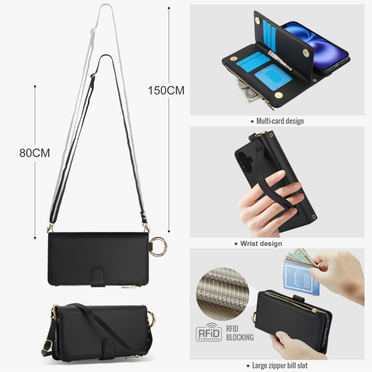Funda de Cuero con Anillo Cruzado y Billetera Multifuncional para iPhone 16 Plus (Negro)