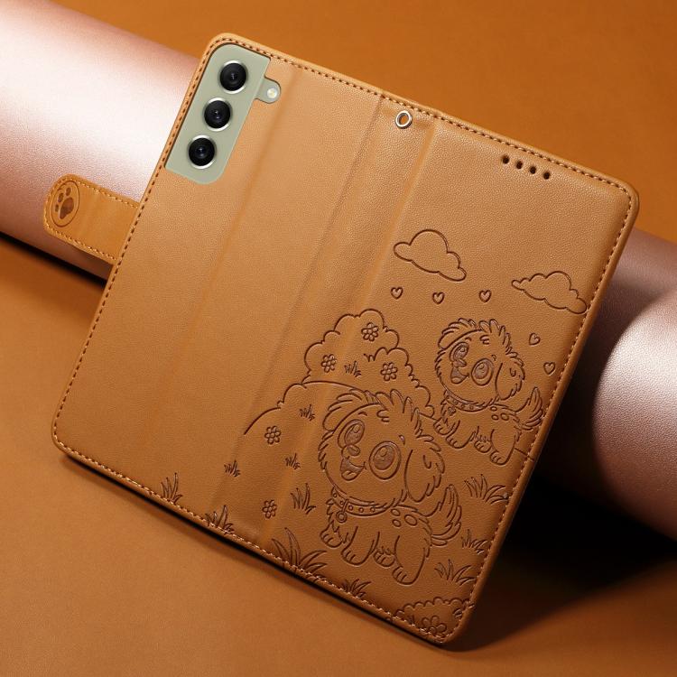 Funda de cuero con bloqueo RFID para Samsung Galaxy S21 FE 5G, con diseño de corazón y perro en relieve (marrón)
