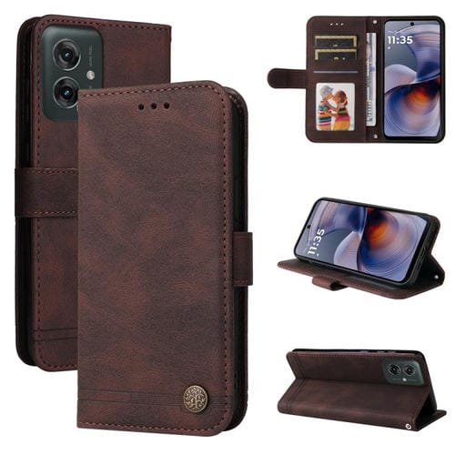 Funda de Cuero Motorola Moto G55 con Botones de Metal y Diseño Árbol de la Vida (Marrón)