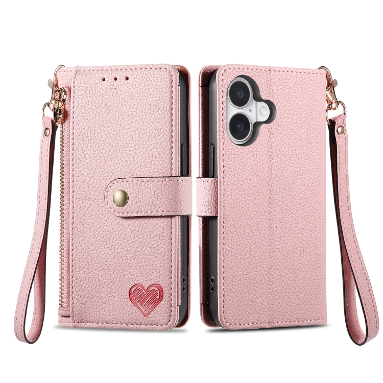 Funda de Cuero con Cordón y Cremallera Love para iPhone 16 Pro (Rosa)