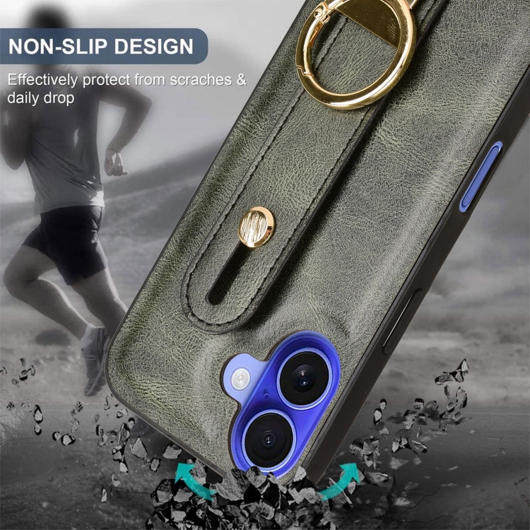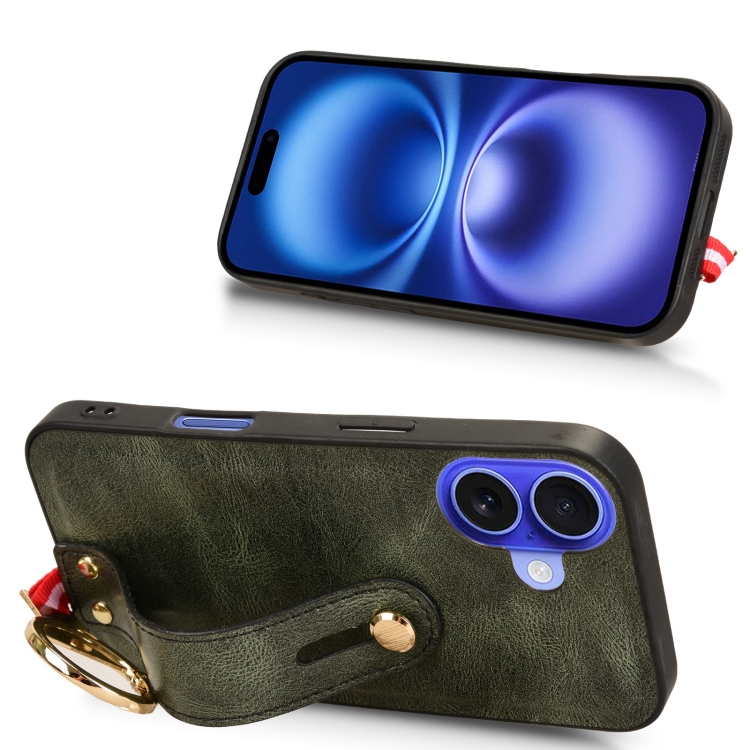 Funda de Cuero con Correa para la Muñeca para iPhone 16 Plus (Verde)