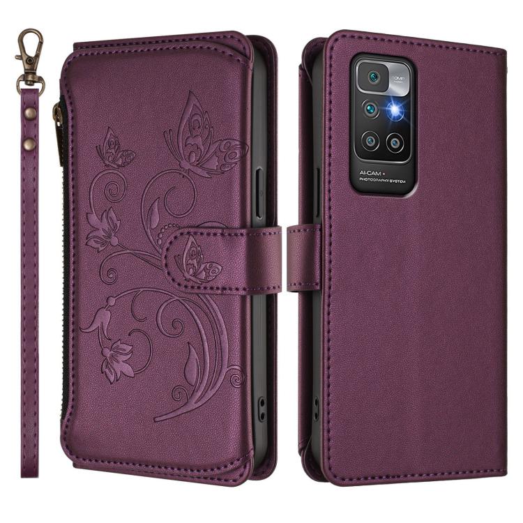 Funda de cuero con cremallera para Redmi 10 2022, diseño de mariposas, flores y mariposas (morado oscuro)