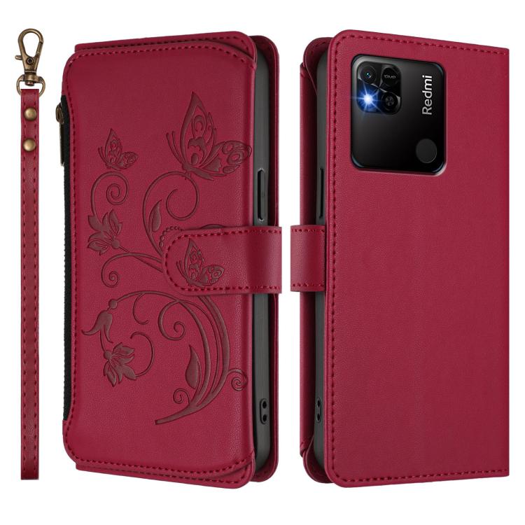 Funda de cuero con cremallera para Redmi 10A/Redmi 9C, diseño de mariposas, flores y amor (rojo vino)