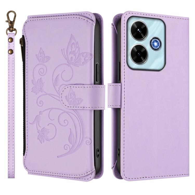Funda de cuero con cremallera para Redmi 13 4G / 5G / 13x / Xiaomi Poco M6 4G, diseño de mariposas y flores, con múltiples tarjetas (morado claro)