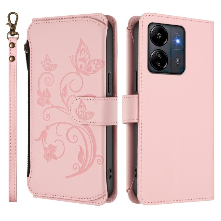 Funda de cuero con cremallera para Redmi 13C 4G / 5G / Xiaomi Poco C65, diseño de mariposas y flores, con múltiples tarjetas (rosa)