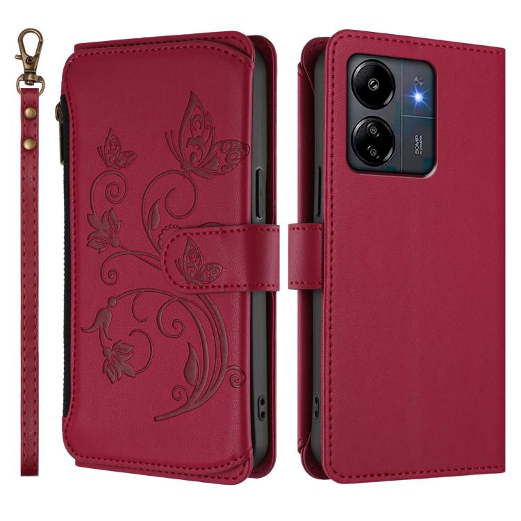 Funda de cuero con cremallera para Redmi 13C 4G / 5G / Xiaomi Poco C65, diseño de mariposas y flores (rojo vino)