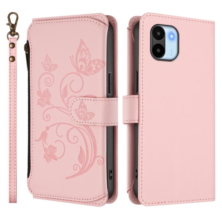 Funda de cuero con cremallera para Redmi A1/Redmi A2, diseño de mariposas y flores, con múltiples tarjetas (rosa)