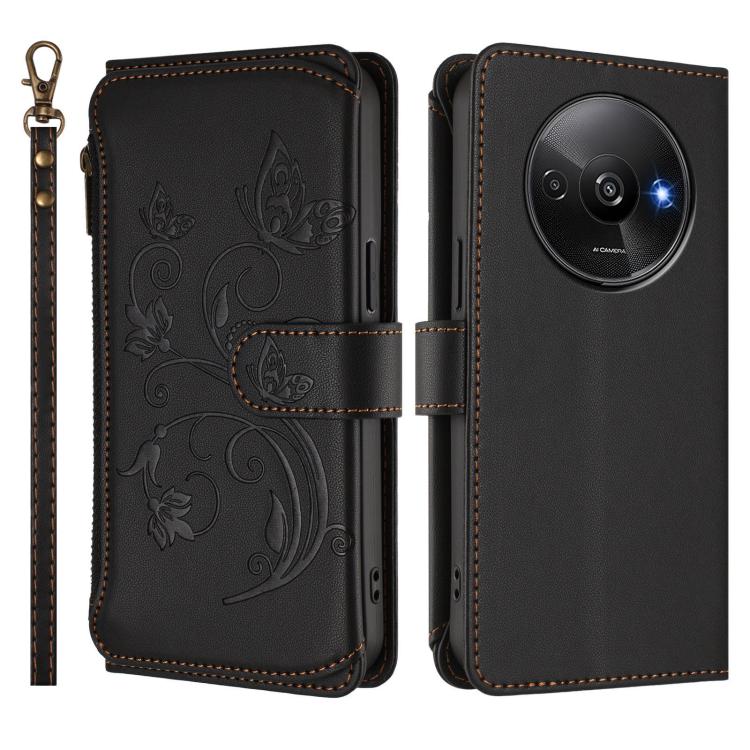 Funda de cuero con cremallera para Redmi A3 / A3x / Xiaomi Poco C61, diseño de mariposas y flores, con múltiples tarjetas (negro)