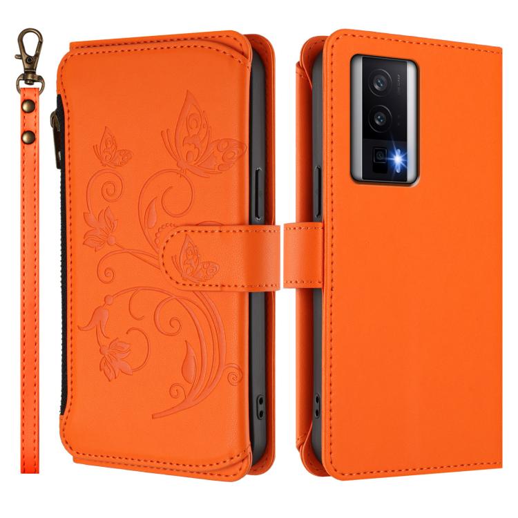 Funda de cuero con cremallera para Redmi K60/K60 Pro, diseño de mariposas, flores y amor, con múltiples tarjetas (naranja)