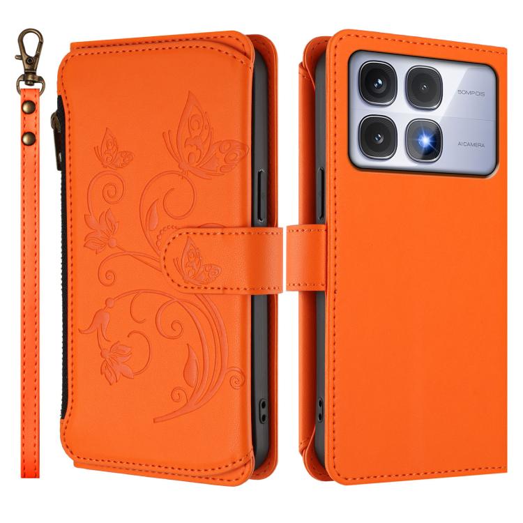 Funda de cuero con cremallera para Redmi K70 Ultra, diseño de mariposas, flores y amor, con múltiples tarjetas (naranja)