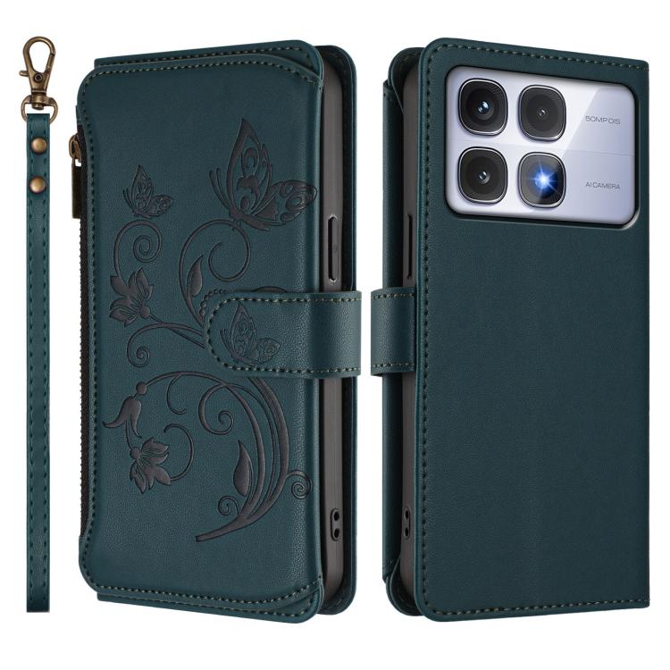 Funda de cuero con cremallera para Redmi K70 Ultra, diseño de mariposas, flores y amor, con múltiples tarjetas (verde oscuro)